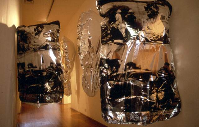 Dominating the show is the idea that Warhol's desire to bend popular imaginary has today crystallised into queer politics. Kaye Shumack's Hardground flattens down 'lesbian chic' stereotypes through a random colour wash while her female/cross dressed photographic performers take on the look of Warhol's filmic anti-heroines. Lesbian safe sex discourse is similarly 'popped' by Rea's Lemons I-IV and Denis Chapman's profane rendition of The Last Supper on rows of shiny tin cans brings camp, supermarket kitsch to the gallery, reducing the most momentous meal in Judaeo-Christian tradition (and Leonardo's vision of it) to the uneventful level of tinned food. Queer strategies aim at destabilising the 'normal' to allow for the unpredictable. This fundamental opposition between reason and accident is played out in Warhol's work through its constant reference to the disastrous encounter of modern technology and chance. Christopher Langton's Crush uses this opposition (referencing Warhol's 1966 Silver Clouds), in his helium inflated polypropylene balloons which have no stable form or position. Affected by the slightest wind currents, they register both local adverts used to shock complacent drivers and the accidental movements of the viewer who can't help but touch them in order to negotiate a passage through the installation. This Warholian use of chance is also evident in Luke Roberts' truly queer Wendy Arthole's Wundercloset. This museum display of warholiana - which includes an authentic Corona beer bottle top allegedly opened by one of Warhol's models with his teeth - foregrounds the value of the indexical fragment as a manifestation of accidental form. The inclusion of original polaroids amongst the precious relics emphasises the accidental quality of traditional forms of photography. This notion of chance and technology is, however, stymied in Denis Chapman's Fake Elvis. The contained arrangement of the grain in this overtly digital reproduction of a section of a public transport billboard is a virtual rebuff of chance. Back in the sixties, the analogue texture of mass imagery was built upon a shifting ground. Similarly, the vacant spaces opened up by Warhol's protest were swiftly occupied with all manner of experiments. What we face today is a mounting degree of closure, in all fronts. Fake Elvis bespeaks this tragedy. It mourns the disavowal of the new and unforeseen. This is where aesthetics, technology and politics share the same impasse of a global apathy for the future. |